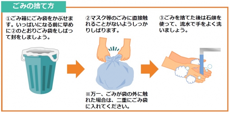 新型コロナウイルスなどの感染症に感染した人やその疑いのある人などがご家庭にいる場合、鼻水などが付着したマスクやティッシュなどのごみを捨てる際は、以下の『ごみの捨て方』に沿って、『ごみに直接触れない』『ごみ袋はしっかりしばって封をする』そして『ごみを捨てた後は手を洗う』ことを心がけましょう。