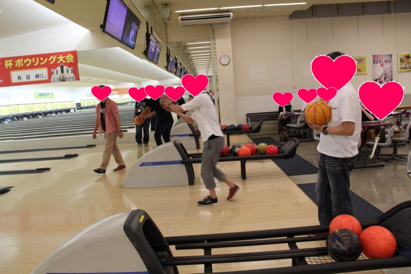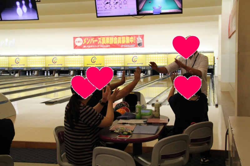14時10分 第一ゲーム開始。ストライクやスペアの時は必ず「ハイタッチ」をするというルール(笑)です