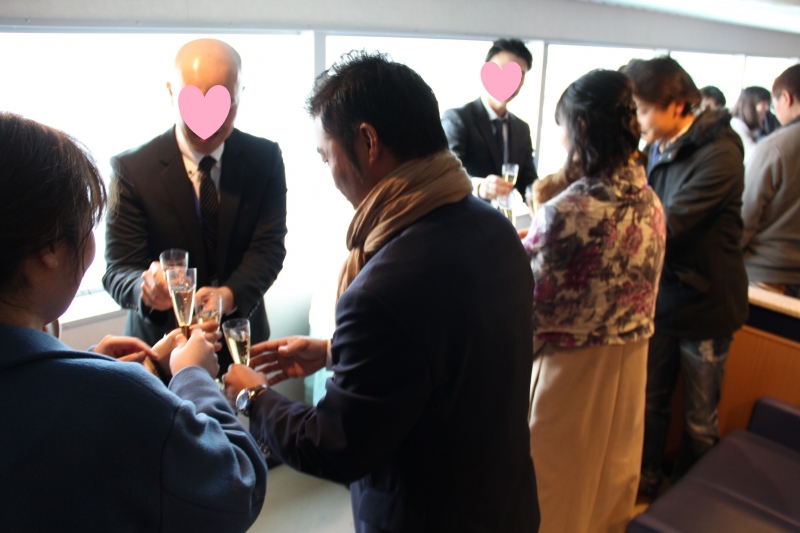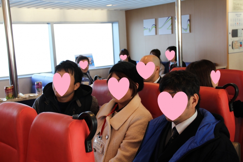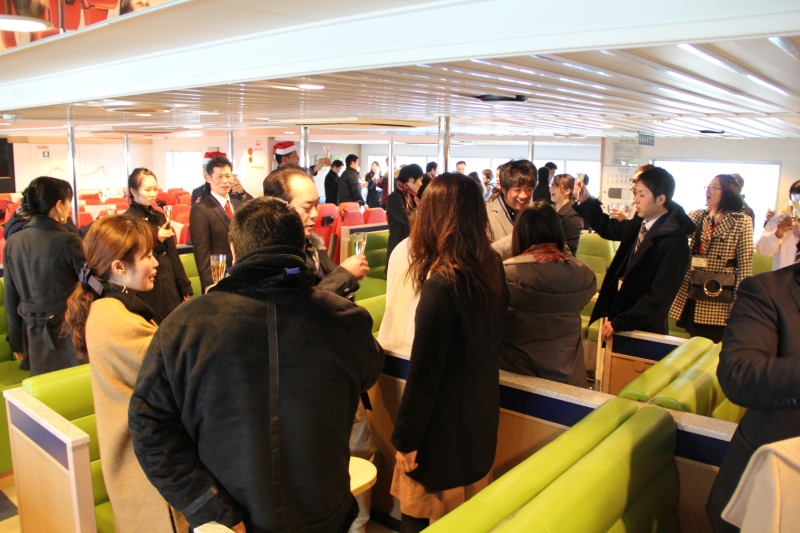 15時15分 フェリーに全員が乗り、みんなで乾杯!