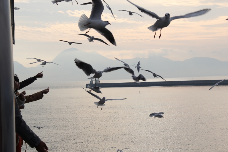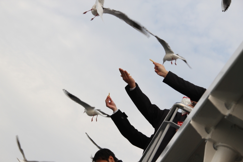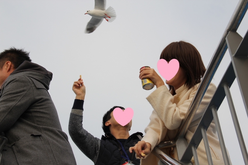 出航前に、男女ペアになってカゴメにかっぱえびせんをあげに外へ。かなり盛り上がりました♪