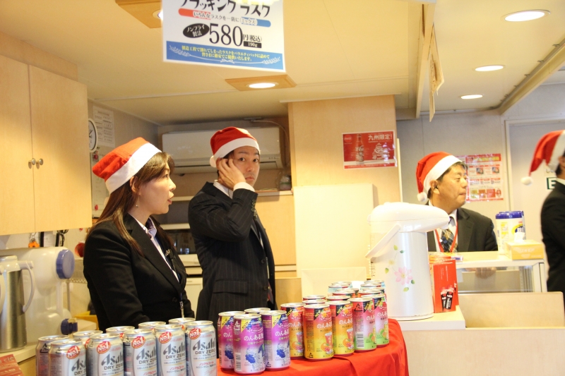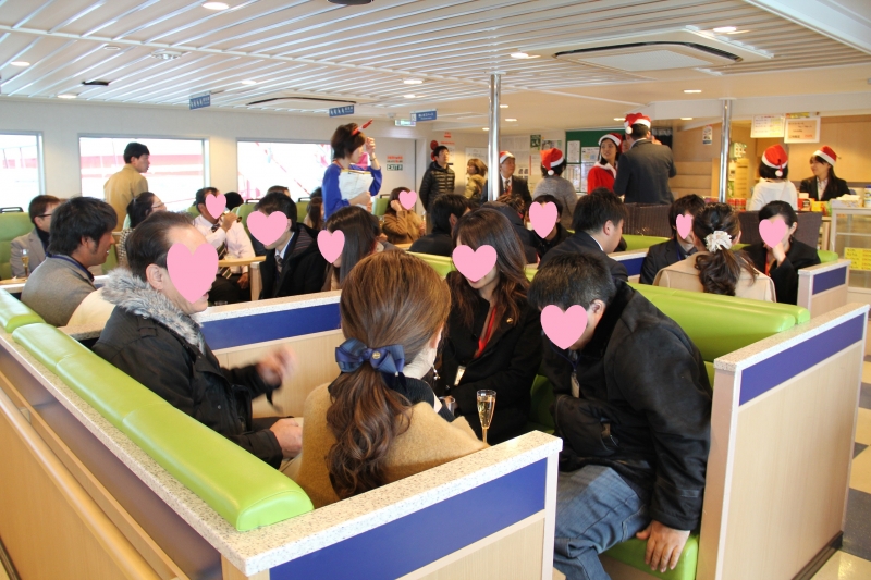 15時 男女がバスに乗って、いざ有明フェリーへ。会場ではスタッフがサンタの装いでお出迎え。