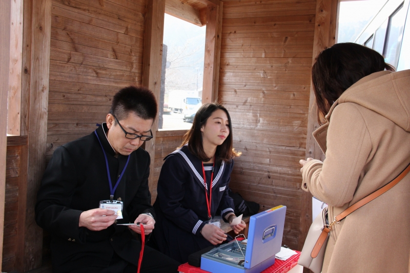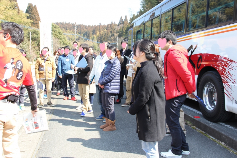 9時半 集合場所は、和水町緑彩館(物産館)駐車場。受付を済ませてバスへ。受付スタッフは中学校の制服でお出迎えです。