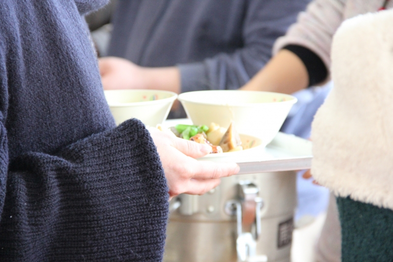 12時 給食係による配膳。食器も鍋もすべて本物の小学校で使っていたもの。懐かしいですね。