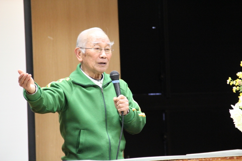 熊本弁ラジオ体操でリラックス。体操を指揮するのは、NHKラジオ体操連盟熊本県理事長で79歳和水町在住の小山忠さんです。元気な小山さんのパワーに参加者たちも自然に笑顔です。