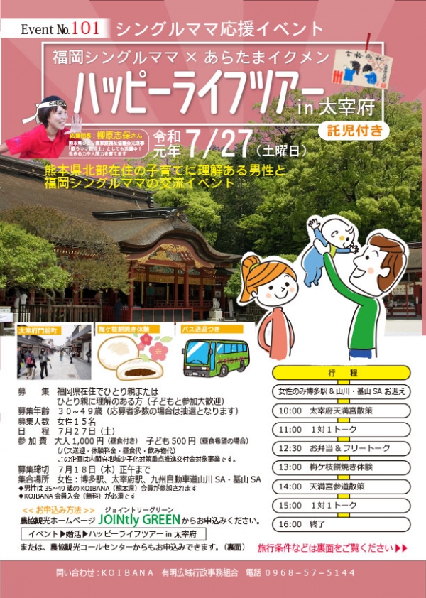 ひとり親や、ひとり親に理解のある男女が、太宰府でトークや散策、梅が枝餅焼き体験などをを行う観光イベントです。