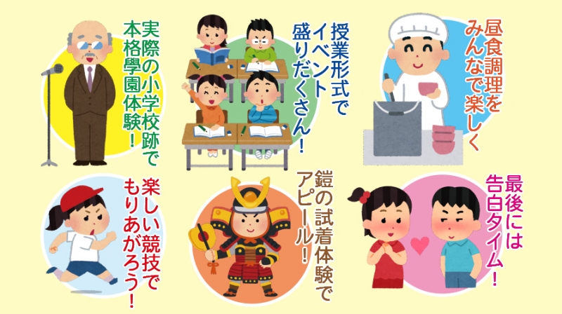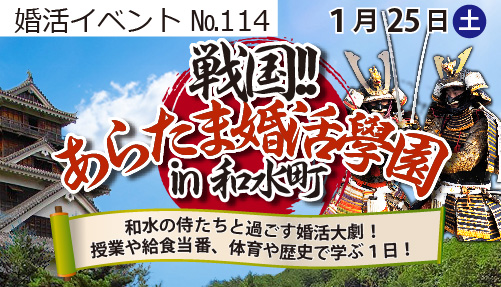 舞台は自然豊かで令和元年の大河ドラマの主人公、金栗四三さんの母校でもある旧春富小学校は、戦国の世、最後の一揆が起こった田中城のふもとにあるお城の形をした小学校。その小学校を舞台に授業形式のイベントを多数行う婚活イベントを開催します。その名も「戦国婚活學園」!。田中城の歴史を伝える「和水町戦国国衆一揆顕彰会」主催による戦国學園体験をお楽しみください!