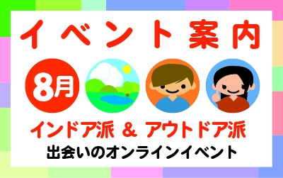 - 内容 アウトドア派が集う出会いのオンラインイベント (途中カップル成立の会員はお先に退場します)