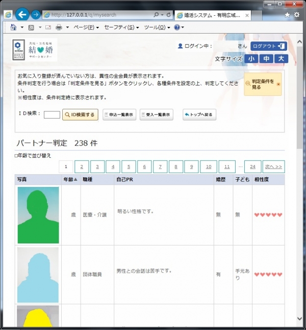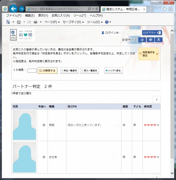 今までにお申し込みを受けたお相手が表示されます。センターからの「お見合い申し込み」の連絡があった場合もこの画面で「お相手」を確認できます。 - 判定条件