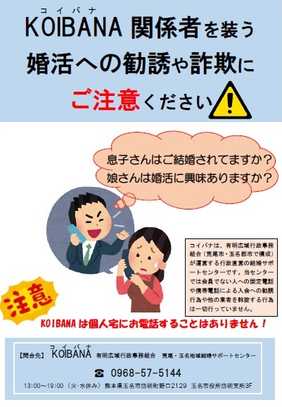 最近、荒尾・玉名管内で、KOIBANA(荒尾・玉名地域)関係者を装い、「お子さんは婚活に興味ありませんか?」「身近に婚活に興味がある人がいれば紹介して欲しい」などといった勧誘の電話がかかってくる事案が発生しています。KOIBANAは個人宅に直接お電話することはありません。幸い被害は報告されておりませんが、もし不審な電話を受け、「おかしいな?」と感じたら、警察、またはKOIBANAへご相談ください。