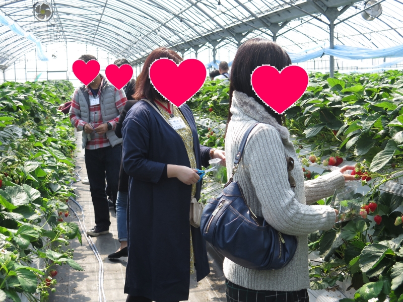 12時30分から お待ちかねのイチゴ狩りです!この日は天気が良く、いちごのハウスの中も少々暑いくらいでしたが、男女和気あいあいの雰囲気で、皆楽しんでました。チューブ入りのコンデンスミルクを持ち込んでいた女性を見た時には、「その手があったか!」と思ってしまいましたね(笑)。