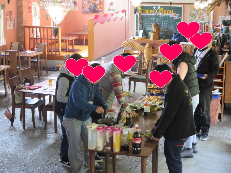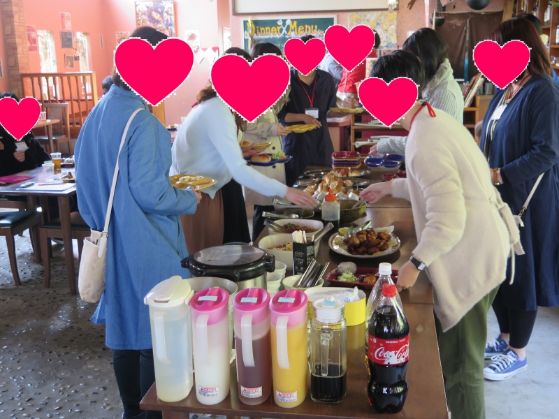 11時から たくさんお話をしたらお腹がすきました。お楽しみのランチタイムです!ブッフェ形式なので、みんなワイワイ楽しみながら好きなものを取っていきます。