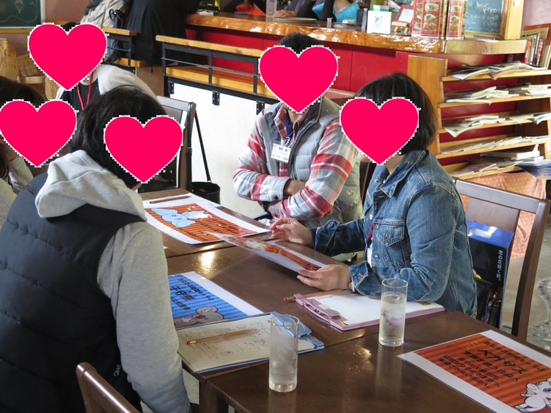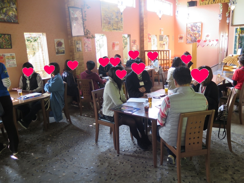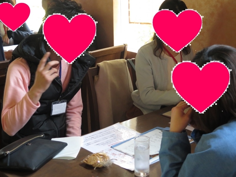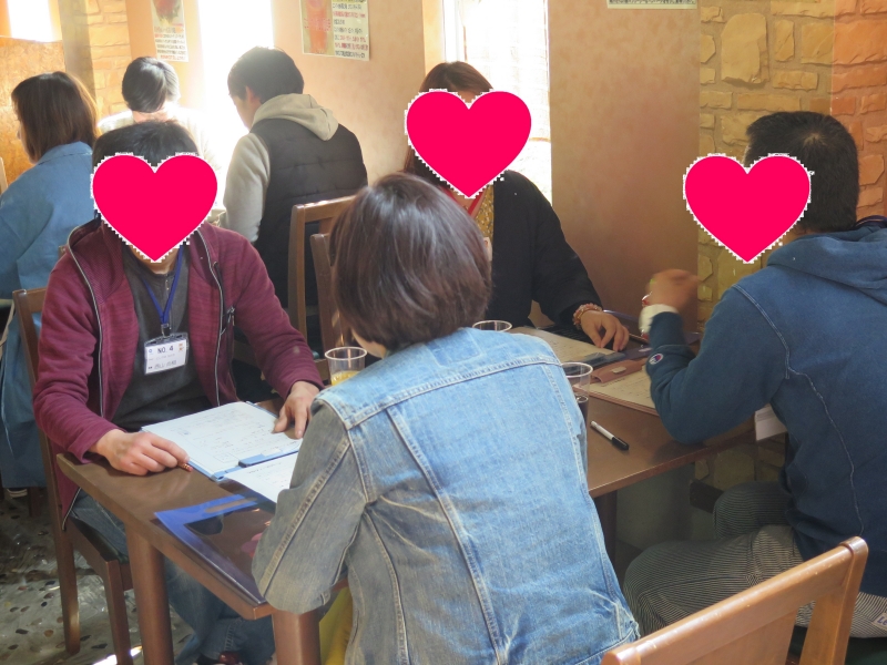 10時10分から 身も心もほぐれたところで、1対1トークです。すぐに時間がたち、名残惜しそうに席を移る方もいらっしゃいました。この後、第一印象カードを記入してもらいました。